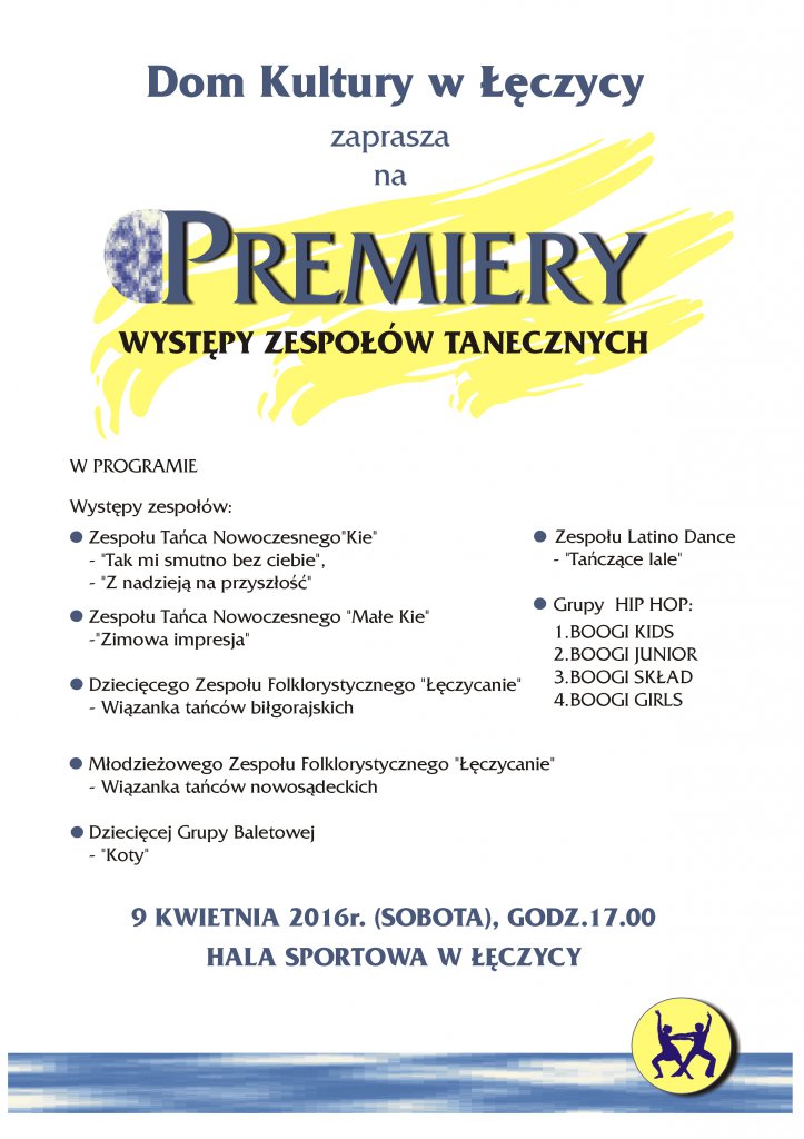 AktualnościDom Kultury w Łęczycy zaprasza na "Premiery" - występy zespołów tanecznych.Występy odbędą się w sobotę, 9 kwietnia o godzinie 17 w hali sportowej w Łęczycy.