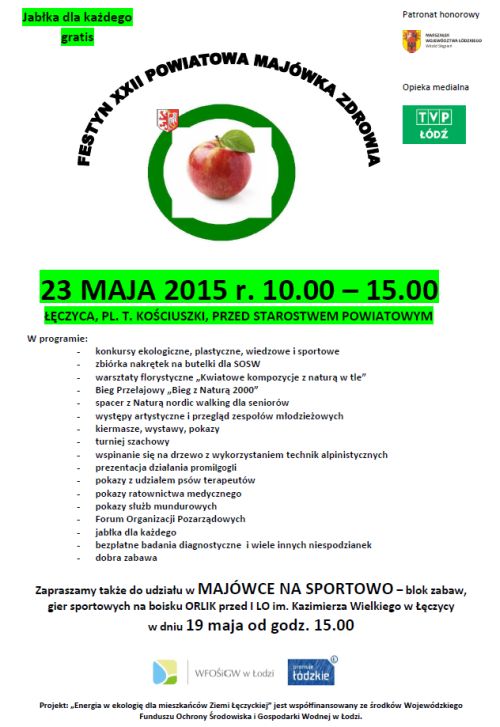AktualnościPrzedstawiamy Panstwu program Festynu XXII Powiatowej Majówki Zdrowia, która odbędzie sie 23 maja w godzinach 10.-15.00 na Placu Tadeusza Kościuszki, przed Starostwem Powiatowym.Ponadto zapraszamy także do udziału w Majówce na sportowo. Impreza odbędzie się na boisku orlik przed I LO im. Kazimierza Wielkiego w Łęczycy w dniu 19 maja od godziny 15.00.