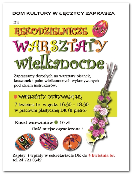 AktualnościDom Kultury w Łęczycy zaprasza dorosłych na "Rękodzielnicze Warsztaty Wielkanocne" - warsztaty pisanek, kraszanek i palm wielkanocnych wykonanych pod okiem instruktorów.Zajęcia odbywać będą się 7 kwietnia w godzinach 16.30 - 18.30 na drugim piętrze DK.
