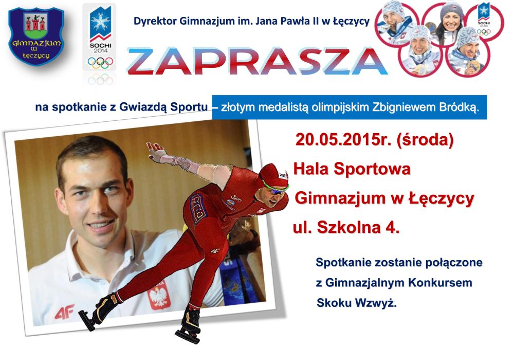 AktualnościDyrektor Gimnazjum im. Jana Pawła II w Łęczycy zaprasza na spotkanie z gwiazdą sportu - złotym medalistą olimpijskim, Zbigniewem Bródką.Spotkanie odbędzie się w środę, 20 maja w hali sportowej Gimnazjum w Łęczycy na ulic Szkolnej. Spotkanie zostanie połączone z Gimnazjalnym Konkursem Skoku Wzwyż.