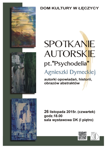 AktualnościDom Kultury w Łęczycy zaprasza na spotkanie autorskie z Agnieszką Dymecką pt. "Psychodelia".Spotkanie odbędzie się 26 listopada (czwartek) o godzinie 18 w sali wystawowej Domu Kultury.