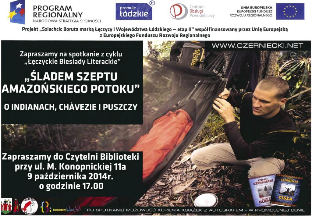 Aktualności9 października zapraszamy na spotkanie pt. "Śladem szeptu amazońskiego potoku" z podróżnikiem Stefanem Czernieckim. Spotkanie odbędzie się o godzinie 17.00 w Miejskiej i Powiatowej Bibliotece Publicznej w Łęczycy.Spotkanie realizowane w ramach projektu "Szlachcic Boruta marką Łęczycy i Województwa Łódzkiego" etap II współfinansowanego przez UE z Europejskiego Funduszu Rozwoju Regionalnego.