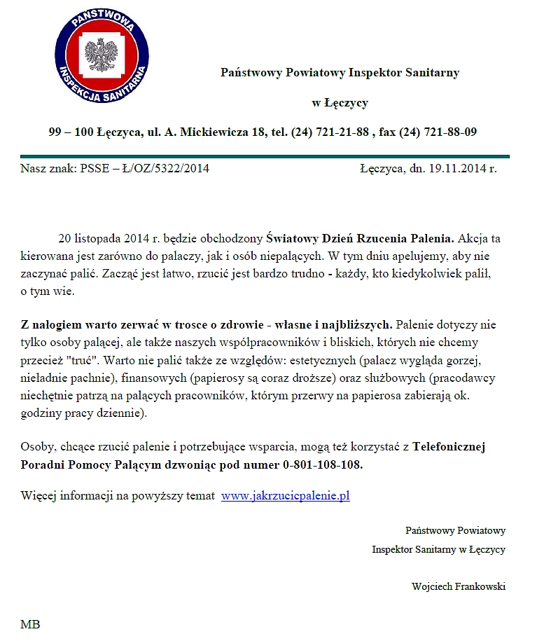 Osoby, chcące rzucić palenie i potrzebujące wsparcia, mogą też korzystać z Telefonicznej Poradni Pomocy Palącym dzwoniąc pod numer 0-801-108-108. Więcej informacji na powyższy temat www.jakrzucicpalenie.pl
