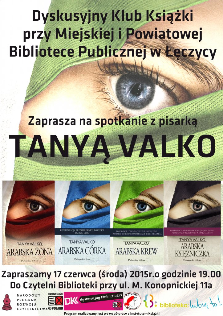 AktualnościDyskusyjny Klub Książki przy Miejskiej i Powiatowej Bibliotece Publicznej w Łęczycy, zaprasza na spotkanie z pisarką TANYĄ VALKO. Zapraszamy 17 czerwca (środa) 2015 r.o godzinie 19.00 Do Czytelni Biblioteki przy ul. M. Konopnickiej 11a Tanya Valko to pseudonim absolwentki Uniwersytetu Jagiellońskiego. Była nauczycielką w Szkole Polskiej w Trypolisie w Libii, następnie asystentką Ambasadora RP, obecnie mieszka w Arabii Saudyjskiej.Jest autorką książek o Libii: Libia od kuchni, Życie codzienne w Trypolisie oraz Sahara ocean ciszy. Autorka sagi arabskiej i azjatyckiej, miłośniczka zdrowego stylu życia.