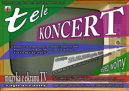 Aktualności26 maja o godzinie 18 w Domu Kultury w Łęczycy odbędzie się koncert w wykonaniu uczniów i nauczycyieli Państwowej Szkoły Muzycznej w Kutnie pt. "tele Koncert".Podczas koncertu odegrana zostanie muzyka z ekranu TV, m.in. utwory z: "07 zgłoś się", "Va Bank", "Janosik" i wiele, wiele innych. Organizatorem sptkania jest Szkoła Muzyczna oraz Dom Kultury w Łęczycy.