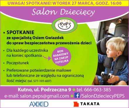 Salon Dziecięcy PEPS w Kutnie przy ul. Podrzecznej 9 w swojej ofercie posiada najbezpieczniejsze foteliki oraz certyfikowany personel, który pomoże w wyborze odpowiedniego fotelika. Przymiarka dziecka oraz montaż fotelika w samochodzie to nasze standardy. Oferujemy to w ramach doboru fotelika i nie wiąże się to z żadną opłatą - bezpieczeństwo Twojego dziecka jest najważniejsze. W swojej ofercie posiadamy najlepsze światowe marki: AXKID, Takata, Britax Romer, Maxi-Cosi, Recaro, Chicco, Graco, BabyJogger, Avionaut i inne. W stałej ofercie na mamy ponad 200 fotelików !Szukasz fotelika - bezpiecznego, wygodnego w najlepszej cenie? - Salon Dziecięcy PEPS to rozwiązanie!