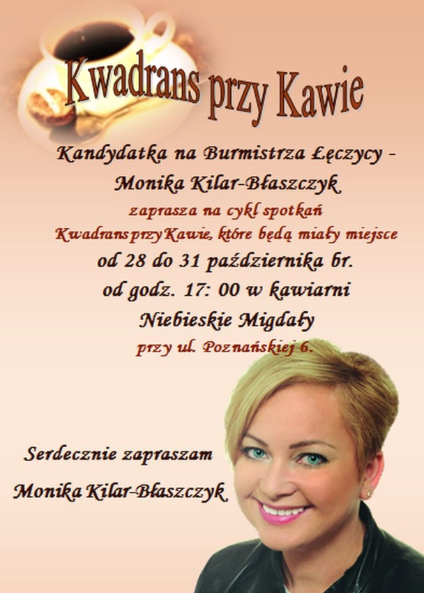 AktualnościKandydatka na Burmistrza Łęczycy - Monika Kilar-Błaszczyk organizuje cykl spotkań Kwadrans przy Kawie, które będą miały miejsce od dzisiaj do 31 października br. od godz. 17:00 w kawiarni Niebieskie Migdały przy ul. Poznańskiej 6.- Serdecznie zapraszam kawa powoli już się zaparza - zachęca M. Kilar-Błaszczyk.Podczas spotkań będzie można zgłosić swoje uwagi, pomysły i propozycje dotyczące miasta i jego przyszłości.Jak zapowiadają organizatorzy żaden problem nie pozostanie bez odpowiedzi.