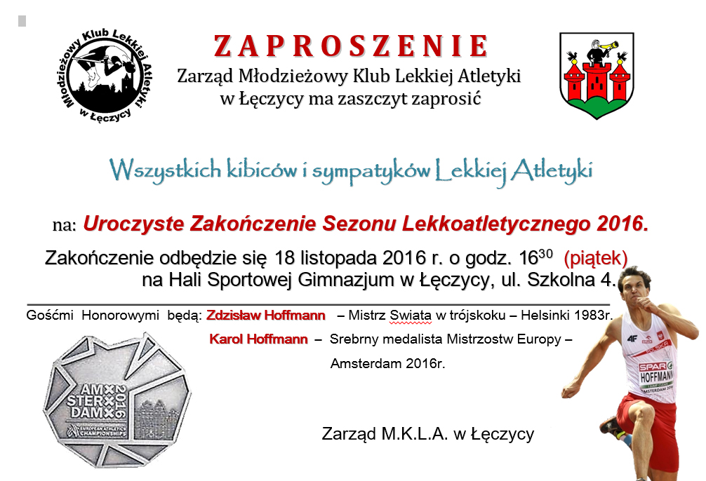 AktualnościDziś o godz. 16.30 w Hali Sportowej Gimnazjum im. Jana Pawła II w Łęczycy, odbędzie się Uroczyste zakończenie Sezonu Lekkoatletycznego 2016 organizowane przez Młodzieżowy Klub Lekkiej Atletyki w Łęczycy.Gośćmi Honorowymi będą: Zdzisław Hoffmann – Mistrz Świata w trójskoku – Helsinki 1983r. oraz Karol Hoffmann – srebrny medalista Mistrzostw Europy – Amsterdam 2016r.