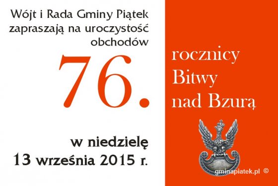 AktualnościWójt i Rada Gminy Piątek zapraszają w niedzielę 13 września na uroczystość obchodów 76. rocznicy Bitwy nad Bzurą.Program uroczystości:- godz. 11:45 - zbiórka uczestników uroczystości na rynku (przed budynkiem Urzędu Gminy Piątek), przemarsz do kościoła p.w. Św. Trójcy;- godz. 12:00 - msza św.;- godz. 13:00 - przemarsz Kompani Honorowej i uczestników uroczystości pod pomnik Bohaterów Bitwy nad Bzurą;- rozpoczęcie uroczystości: wystąpienie wójta gminy Piątek, przemówienia, apel poległych, salwa honorowa, złożenie kwiatów pod pomnikiem, defilada pododdziału.Kompanię honorową wystawia Wielkopolska Szkoła Podoficerska Wojsk Lądowych im. gen. bryg. Franciszka Seweryna Włada w Poznaniu.
