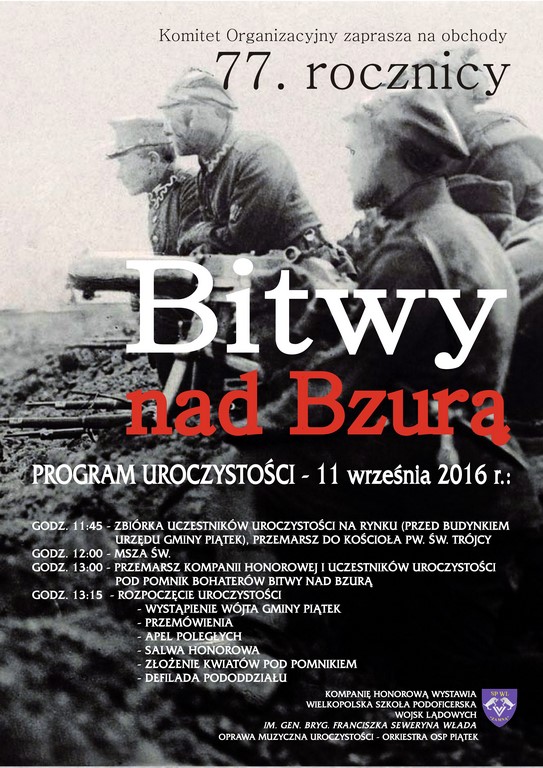 AktualnościKomitet organizacyjny zaprasza na uroczystość obchodów 77. rocznicy Bitwy nad Bzurą, która odbędzie się w Piątku, w niedzielę 11września.Program:11:45 - zbiórka uczestników uroczystości na rynku (przed budynkiem Urzędu Gminy Piątek), rzemarsz do kościoła pw. Św. Trójcy12:00 - Msza Św.13:00 - przemarsz kompanii honorowej i uczestników uroczystości pod pomnik Bohaterów Bitwy nad Bzurą przy ZSMR w Piątku - ul. Kutnowska 1913:15 - rozpoczęcie uroczystości: - wystąpienie wójta gminy piątek - przemówienia - apel poległych - salwa honorowa - złożenie kwiatów pod pomnikiem - defilada pododdziału
