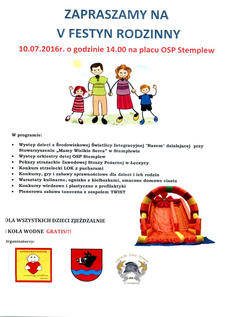 AktualnościUrząd Gminy w Stemplewie zaprasza na V Festyn Rodzinny, który odbędzie się 10 lipca o godzinie 14 na placu OSP Stemplew.Dla wszystkich dzieci zjeżdzalnie i koła wodne gratis! Pełen program w załączniku.