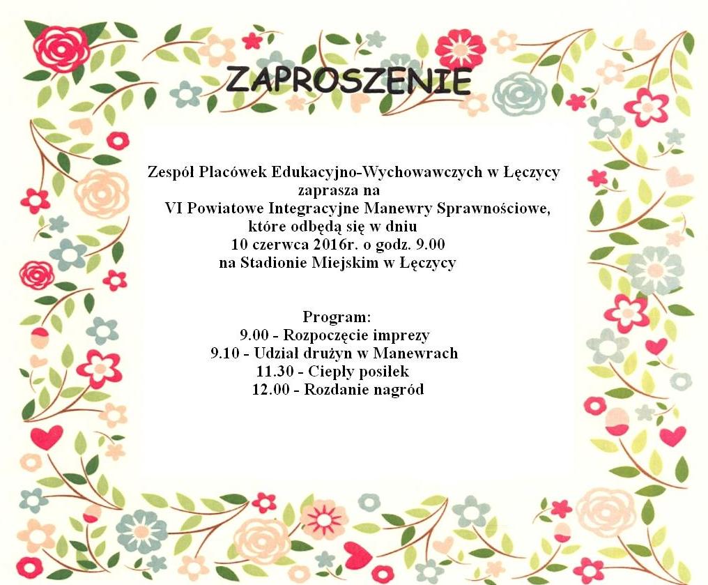 AktualnościZespół Placówek Edukacyjno-Wychowawczych w Łęczycy zaprasza na VI Powiatowe Integracyjne Manewry Sprawnościowe, które odbędą się w dniu 10 czerwca o godz. 9 na stadionie miejskim.