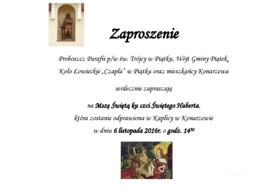 AktualnościProboszcz parafii p.w. Św. Trójcy w Piątku, Wójt Gminy Piątek, Koło Łowieckie "Czapla" w Piątku oraz mieszkańcy Konarzewa zapraszają na Mszę Św. ku czci Świętego Huberta, która zostanie odprawiona w Kaplicy w Konarzewie, w dniu 6 listopada o godz. 14:30.
