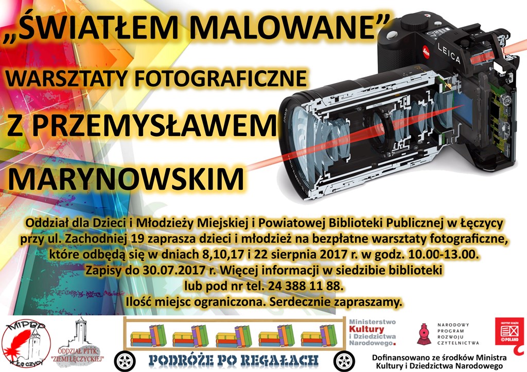 AktualnościOddział dla Dzieci i Młodzieży Miejskiej i Powiatowej Biblioteki Publicznej w Łęczycy zaprasza dzieci i młodzież na bezpłatne warsztaty fotograficzne, które poprowadzi Pan Przemysław Marynowski – łęczycki artysta-fotograf.Tematyka warsztatów:•posługiwanie się sprzętem fotograficznym – poznanie budowy i funkcji aparatu,•wybrane wiadomości z zakresu teorii fotografii,•zasady kompozycji kadru zdjęciowego,•poznanie różnych dziedzin fotografii,•podstawy obsługi programów do obróbki zdjęć.Warsztaty odbędą się w dniach 8,10,17,22 sierpnia 2017 r. w godz. 10.00-13.00.Zapisy do 30.07.2017 r. w Oddziale dla Dzieci i Młodzieży MiPBP w Łęczycy przy ul. Zachodniej 19. Więcej informacji w siedzibie biblioteki lub pod nr tel. 24 388 11 88. Ilość miejsc ograniczona. Serdecznie zapraszamy!Warsztaty odbędą się w ramach projektu „Podróże po regałach” dofinansowanego ze środków Ministra Kultury i Dziedzictwa Narodowego w ramach programu „Partnerstwo Dla Książki 2017”.