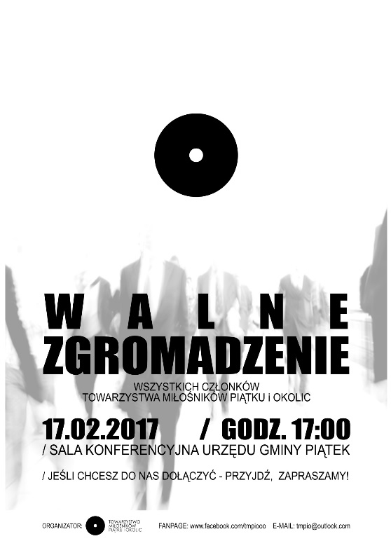 AktualnościZarząd Towarzystwa Miłośników Piątku i Okolic informuje o zwołaniu Walnego Zgromadzenia dla wszystkich członków stowarzyszenia 17 lutego na godz. 17:00.Zgromadzenie odbędzie się w siedzibie Urzędu Gminy Piątek, w głównej sali konferencyjnej.