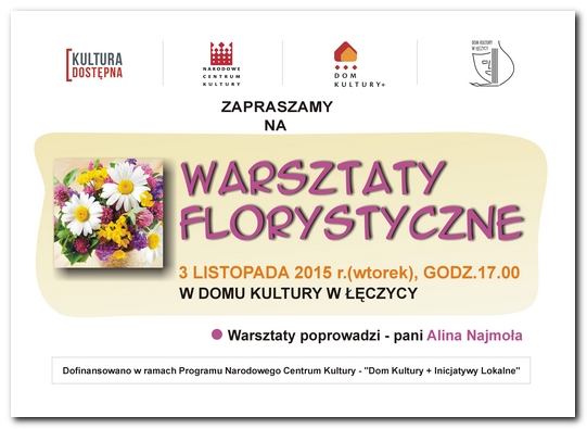 AktualnościJuż dziś (3 listopada br.) o godzinie 17.00 w Domu Kultury w Łęczycy odbędą się warsztaty florystyczne. Zajęcia organizowane są w ramach projektu Dom Kultury+ Inicjatywy Lokalne i są finansowane przez Narodowe Centrum Kultury.Będzie to już drugie spotkanie miłośników sztuki układania kwiatów w łęczyckiej placówce. Na zajęciach warsztatowych prezentowane są podstawy i bardziej zaawansowane techniki. Warsztaty prowadzi Pani Alina Najmoła.Zapisy w sekretariacie Domu Kultury.