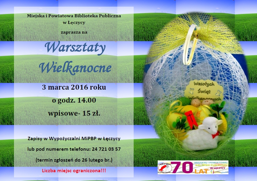 AktualnościMiejska i Powiatowa Biblioteka Publiczna w Łęczycy zaprasza na Warsztaty Wielkanocne, które odbędą się 3 marca o godz. 14, wpisowe - 15 zł. Zapisy w Wypożyczalni MiPBP w Łęczycy lub pod numerem telefonu: 24 721 03 57 (termin zgłoszeń do 26 lutego). Liczba miejsc ograniczona.