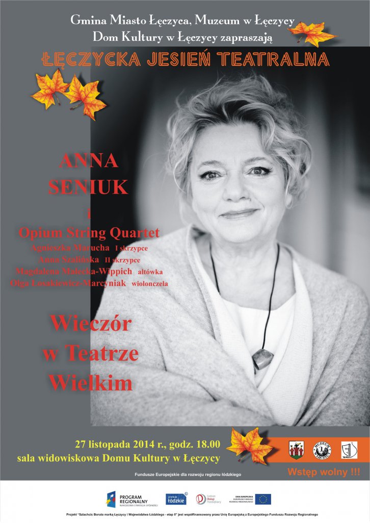 AktualnościGmina Miasto Łęczyca, Muzeum w Łęczycy oraz Dom Kultury w Łęczycy zapraszają na Łęczycką Jesień Teatralną. Gościem specjalnym będzie Anna Seniuk i Opium String Quartet."Wieczór w Teatrze Wielkim" odbędzie się w czwartek, 27 listopada o godzinie 18:00 w sali widowiskowej Domu Kultury w Łęczycy. Wstęp wolny.