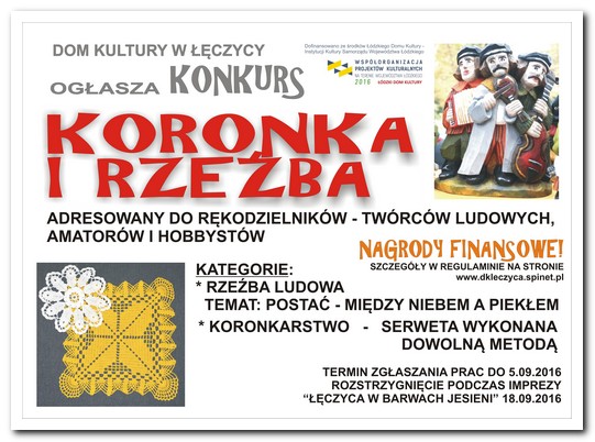AktualnościDom Kultury w Łęczycy ogłasza konkurs ph. "Koronka i rzeźba", adresowany do rękodzielników - twórców ludowych, amatorów i hobbystów.Kategorie:*rzeźba ludowa - temat: postać - między niebem a piekłem*koronkarstwo - serweta wykonana dowolną metodą