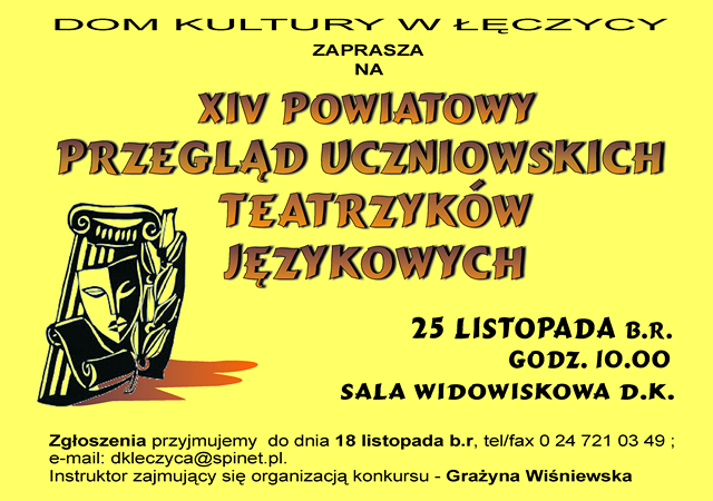AktualnościDom Kultury w Łęczycy zaprasza na XIV Powiatowy Przegląd Uczniowskich Teatrzyków Językowych, który odbędzie się 25 listopada o godzinie 10:00, w sali widowiskowej Domu Kultury.Zgłoszenia przyjmowane są do dziś. Instruktorem zajmującym się organizacją konkursu jest Grażyna Wiśniewska.