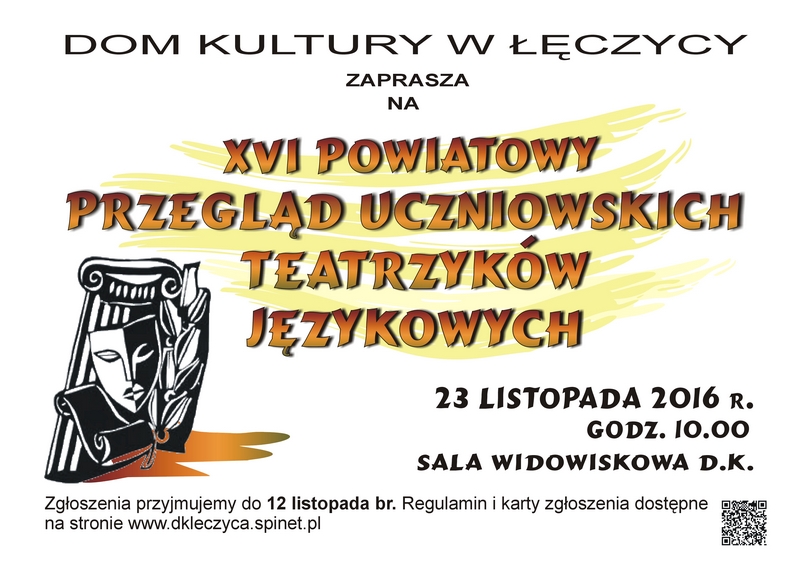 AktualnościDom Kultury w Łęczycy zaprasza na XVI Powiatowy Przegląd Uczniowskich Teatrzyków Językowych, który odbędzie się 23 listopada o godzinie 10 w sali widowiskowej Domu Kultury.