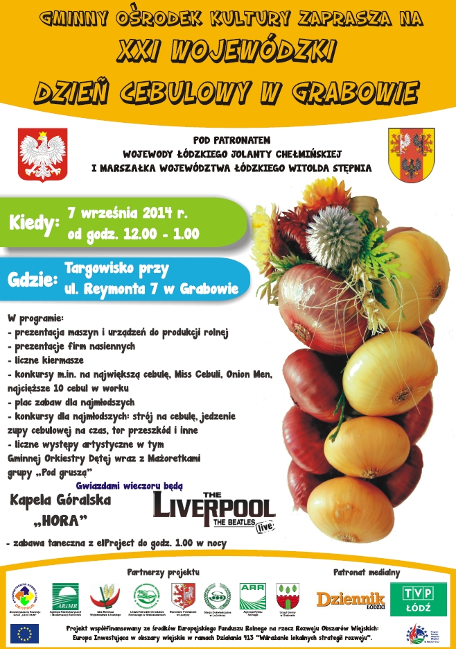 AktualnościGminny Ośrodek Kultury w Grabowie zaprasza na XXI Wojewódzki Dzień Cebulowy, który odbędzie się w niedzielę, 7 września w godz. 12:00 - 1:00. Miejscem imprezy będzie targowisko przy ul. Reymonta 7 w Grabowie.W programie m.in.: prezentacja maszyn, firm, liczne kiermasze, konkursy, liczne występy artystyczne. Gwiazdami wieczoru będą: kapela góralska "Hora" i The Liverpool. Tuż po nich zabawa taneczna z elProject do godz. 1:00 w nocy.Impreza pod patronatem Wojewody Łódzkiego Jolanty Chełmińskiej i Marszałka Województwa Łódzkiego Witolda Stępnia.