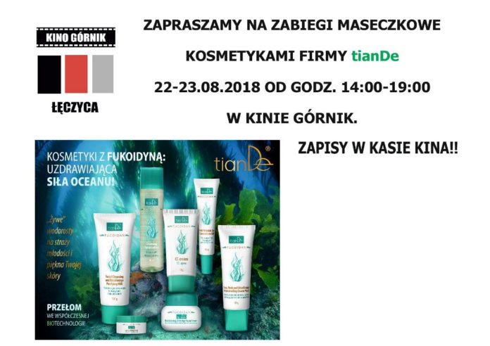AktualnościKino Górnik serdecznie zaprasza na tanie zabiegi maseczkowe z wykorzystaniem kosmetyków firmy tianDe w dniach 22-23 sierpnia od godz. 14:00 do 19:00. Zapisów można dokonywać w kasie kina.