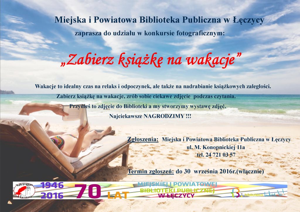 AktualnościMiejska i Powiatowa Biblioteka Publiczna w Łęczycy zaprasza do udziału w konkursie fotograficznym pn. "Zabierz książkę na wakacje". Wakacje to idealny czas na relaks i odpoczynek, ale także na nadrabianie książkowych zaległości.Zabierz książkę na wakacje, zrób sobie ciekawe zdjęcie podczas czytania. Przynieś to zdjęcie do Biblioteki a my stworzymy wystawę zdjęć. Najciekawsze NAGRODZIMY!Zgłoszenia: Miejska i Powiatowa Biblioteka Publiczna w Łęczycy, ul. M. Konopnickiej 11a, tel. 24 721 03 57Termin zgłoszeń: do 30 września 2016 r. (włącznie).