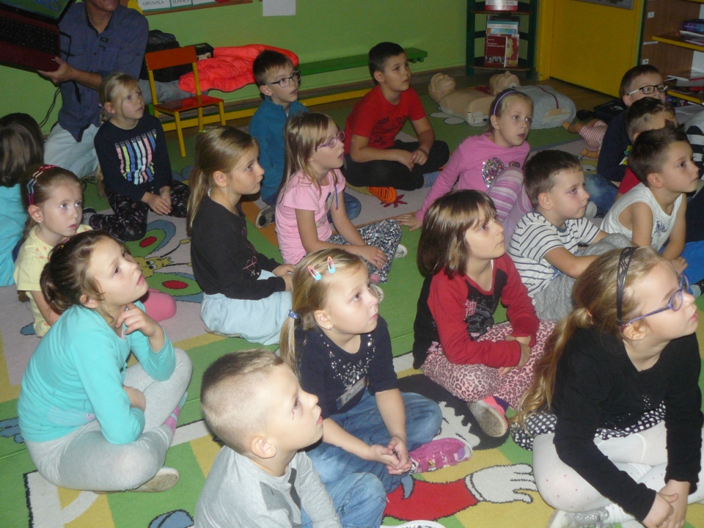 Wiele emocji wzbudził w dzieciach pokaz czynności z zakresu resuscytacji wykonany na fantomie. Dzieci pod czujnym okiem pana Witolda Pacholskiego - ratownika medycznego, mogły samodzielnie wykazać się praktyczną znajomością udzielania pierwszej pomocy. Utrwaliły również znajomość numerów alarmowych.