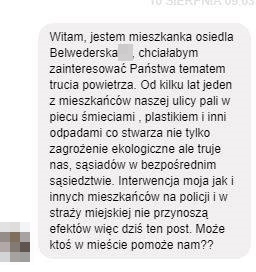 - Jestem mieszkanką osiedla Belwederska. Chciałabym zainteresować Państwa tematem trucia powietrza. Od kilku lat jeden z mieszkańców naszej ulicy pali w piecu śmieciami, plastikiem i inni odpadami, co stwarza nie tylko zagrożenie ekologiczne ale truje nas, sąsiadów w bezpośrednim sąsiedztwie. Interwencja moja jak i innych mieszkańców na policji i w straży miejskiej nie przynoszą efektów więc dziś ten post. Może ktoś w mieście pomoże nam? - pisze do nas nasza czytelniczka, która załącza także nagranie rejestrujące komin i wydobywający się z niego dym.