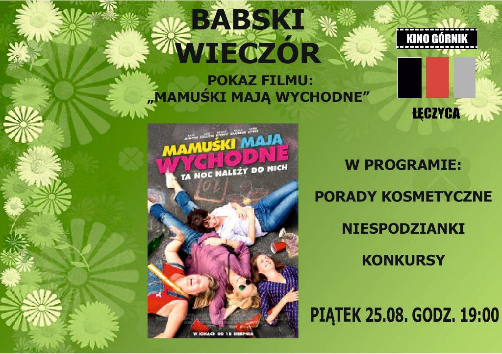 Aktualności25 sierpnia (piątek) o godzinie 19:00 w łęczyckim kinie Górnik odbędzie się kolejna edycja Babskiego Wieczoru. Tego dnia panie obejrzą film "Mamuśki mają wychodne". Nie zabraknie także innych atrakcji oraz nagród-niespodzianek.
