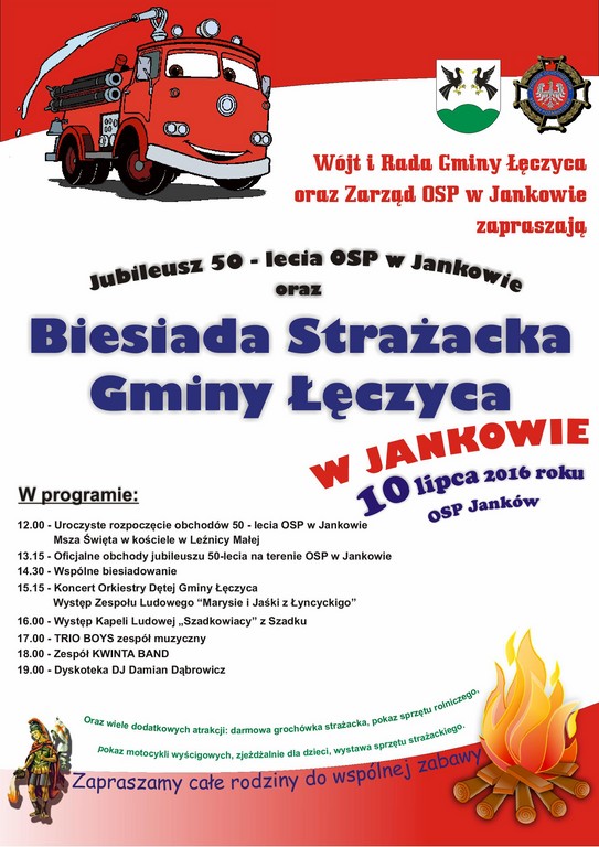 AktualnościWójt i Rada Gminy Łęczyca oraz Zarząd Ochotniczej Straży Pożarnej w Jankowie serdecznie zapraszają na uroczyste obchody Jubileuszu 50-lecia OSP w Jankowie oraz Biesiadę Strażacką Gminy Łęczyca, która odbędzie się w Jankowie 10 lipca (niedziela).W programie:12:00 – Uroczyste rozpoczęcie obchodów 50-lecia OSP w Jankowie; Msza Święta w kościele w Leźnicy Małej13:15 – Oficjalne obchody jubileuszu 50-lecia na terenie OSP w Jankowie14:30 – Wspólne biesiadowanie15:15 – Koncert Orkiestry Dętej Gminy Łęczyca; występ Zespołu Ludowego „Marysie i Jaśki z Łyncyckigo”16:00 – Występ Kapeli Ludowej „Szadkowiacy” z Szadku17:00 – TRIO BOYS – zespół muzyczny18:00 – Zespół KWINTA BAND19:00 – Dyskoteka DJ Damian DąbrowiczPondato wiele dodatkowych atrakcji: darmowa grochówka strażacka, pokaz sprzętu rolniczego, pokaz motocykli wyścigowych, zjeżdżalnie dla dzieci oraz wystawa sprzętu strażackiego.