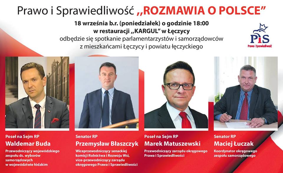 AktualnościParlamentarzyści Prawa i Sprawiedliwości gorąco zapraszają mieszkańców na spotkanie pod nazwą: Prawo i Sprawiedliwość „Rozmawia o Polsce”, które odbędzie się 18 września (poniedziałek) o godzinie 18:00 w restauracji Kargul w Łęczycy.Na spotkaniu obecni będą:- Senator RP Przemysław Błaszczyk – wiceprzewodniczący senackiej komisji rolnictwa i rozwoju wsi, wiceprzewodniczący zarządu okręgowego Prawa i Sprawiedliwości - Senator RP Maciej Łuczak – koordynator okręgowego zespołu samorządowego - Poseł na Sejm RP Marek Matuszewski – przewodniczący zarządu okręgowego Prawa i Sprawiedliwości - Poseł na Sejm RP Waldemar Buda – przewodniczący wojewódzkiego zespołu ds. wyborów samorządowych w województwie łódzkim