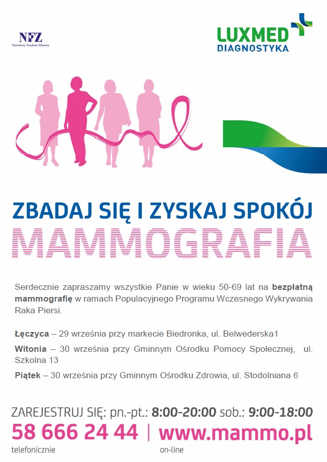 AktualnościBezpłatna mammografia dla Pań w wieku 50-69 lat w ramach Populacyjnego Wczesnego Wykrywania Raka Piersi.Łęczyca - 29 września przy markecie Biedronka na ulicy Belwederskiej 1;Witonia - 30 września przy GOPS,Piątek - 30 września przy GOZ.