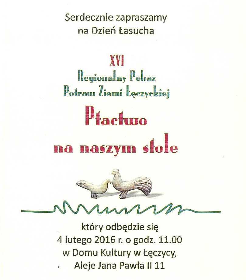 AktualnościDom Kultury w Łęczycy zaprasza na Dzień Łasucha, czyli XVI Regionalny Pokaz Potraw Ziemi Łęczyckiej "Ptactwo na naszym stole".Dzień Łasucha odbędzie się 4 lutego o godz. 11 w Domu Kultury w Łęczycy.