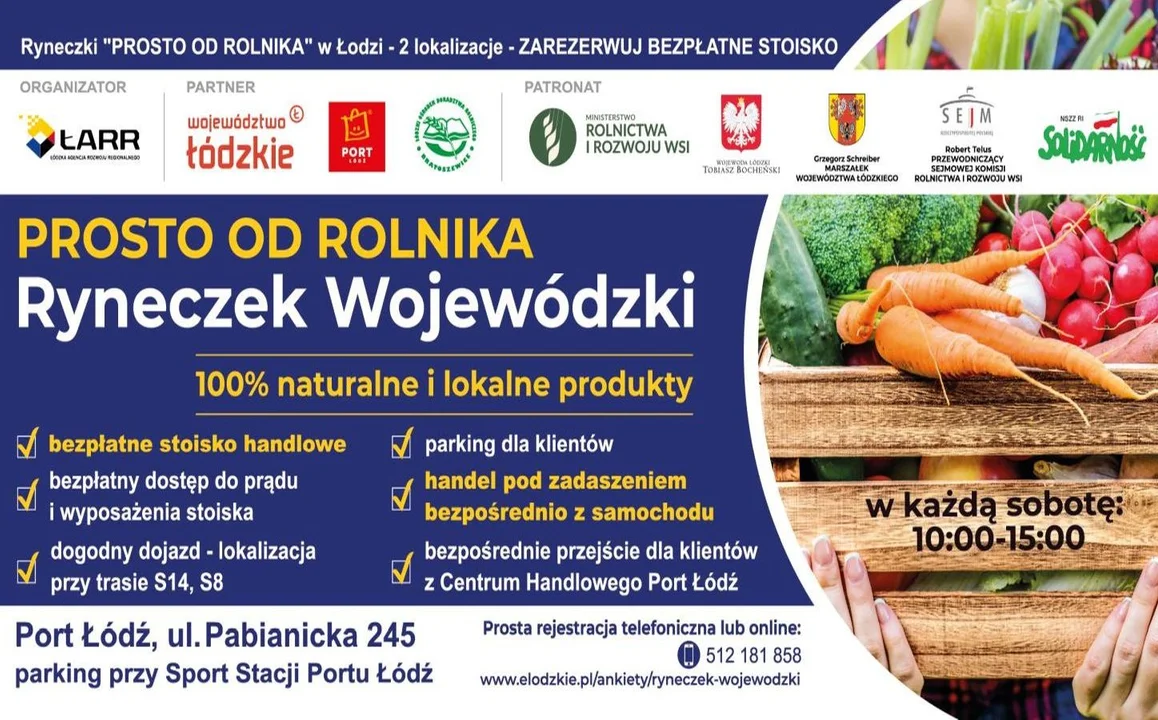 Bezpłatne stoiska dla rolników, sadowników, kół gospodyń wiejskich, pszczelarzy i innych przedstawicieli branży rolniczej. Handel pod zadaszeniem – bezpośrednio z samochodu, dogodny dojazd i przestronny parking. Producentów zaprasza Grzegorz Schreiber, Marszałek Województwa Łódzkiego.