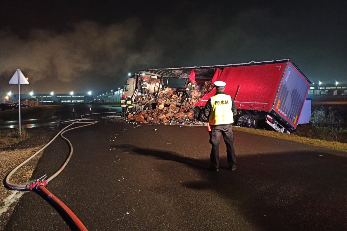 Łódzkie. Płonący TIR z materiałami łatwopalnymi. Nocna akcja strażaków