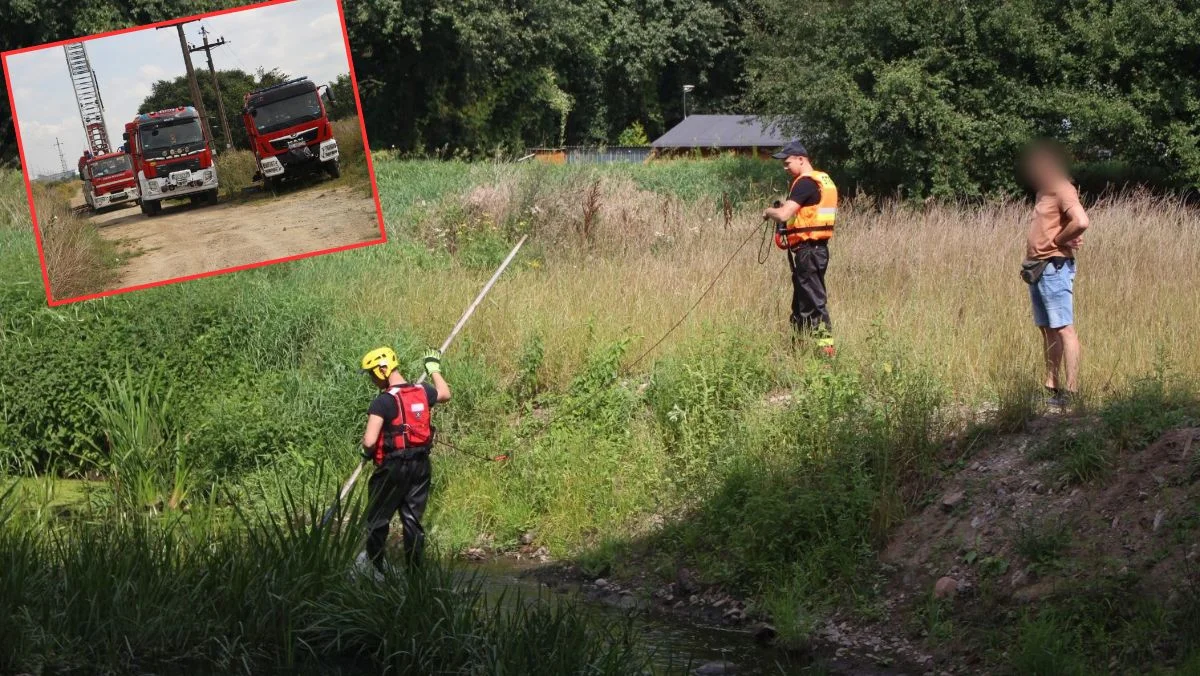 Strażacy sprawdzają koryto rzeki Ochni. Sprawdzane są również okoliczne zarośla. Przy użyciu wozu z podnośnikiem teren poszukiwań obserwowany jest z góry.