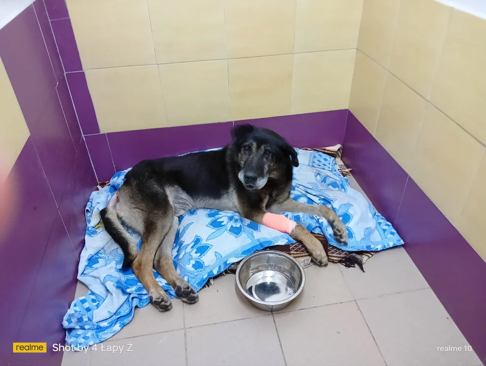 Jak się okazało to około 17-letni, 38-kilogramowy psiak. Został zbadany przez weterynarza, który stwierdził m.in. niedowład tylnych łap i zainfekowaną ranę w której zalegały larwy much.