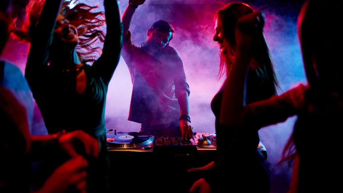 Taneczna noc w klimacie lat 70., z dekoracjami i muzyką disco.