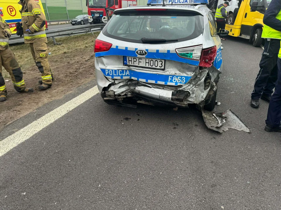 Na skutek tego rozbite zostały samochód patrolu autostradowego i policyjny radiowóz. Jedna osoba odniosła niegroźne obrażania. Policja kierowała ruch z autostrady objazdem na DK92.
