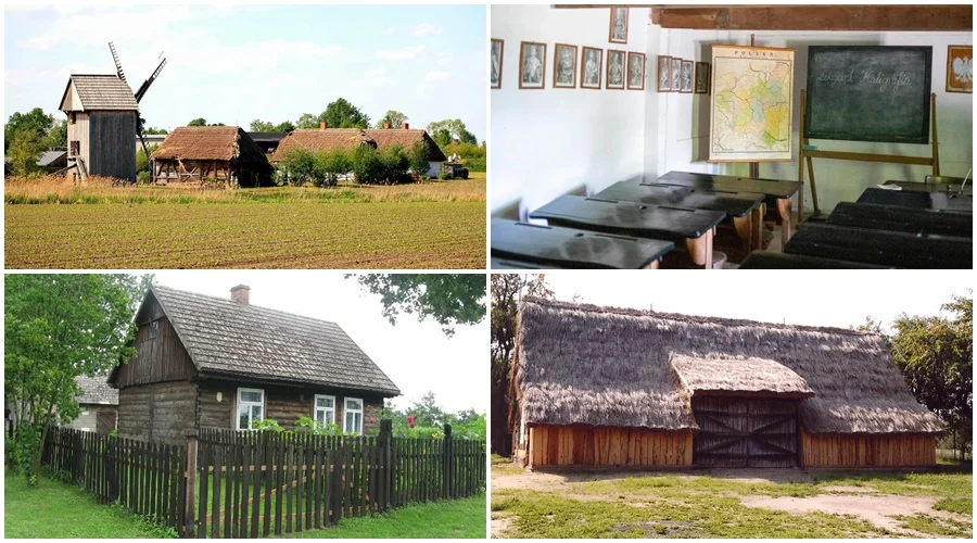 W skansenie znajdziemy małą architekturę – kapliczki, studnie i przydrożne krzyże. Zobaczycie, jak kiedyś wyglądały wnętrza domostw. Są budynki rzemieślnicze i ochrony przeciwpożarowej (rekonstrukcja strażnicy ze Złakowa Borowego, bróg z ekspozycją sprzętu strażackiego).